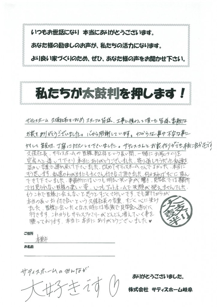 サティスホーム久保社長をはじめ、スタッフの皆様、工事に携わって頂いた皆様、素敵なお家をありがとうございました。