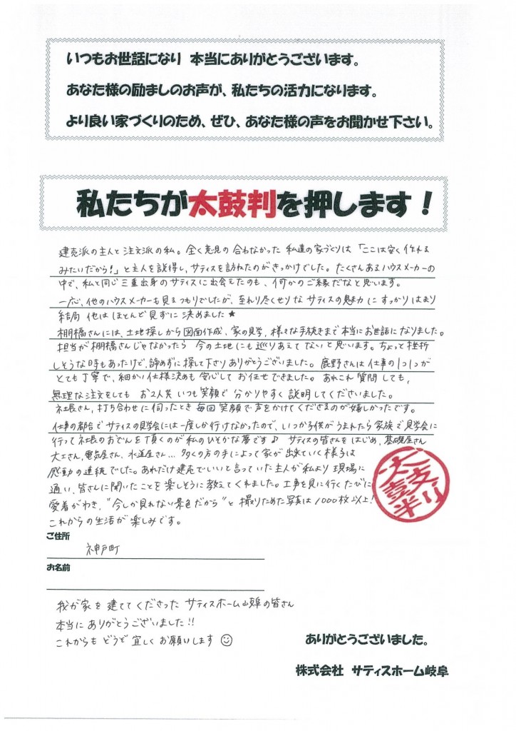 我が家を建ててくださったサティスホーム岐阜の皆さん、本当にありがとうございました!!
