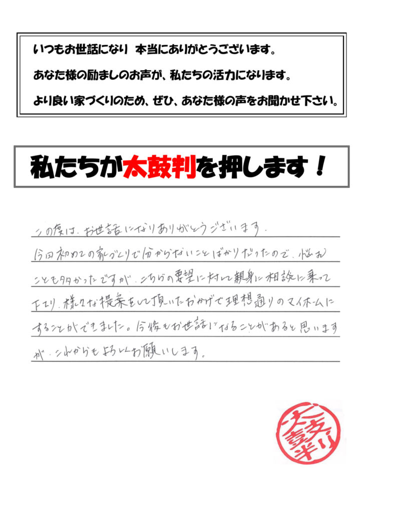 様々な提案をして頂いたおかげで理想通りのマイホームにすることができました。