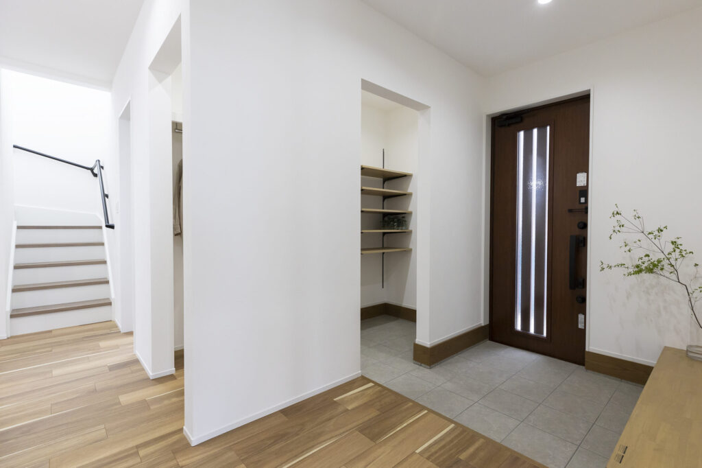 玄関には隠せる大容量の土間収納と、座れるカウンターを配置
