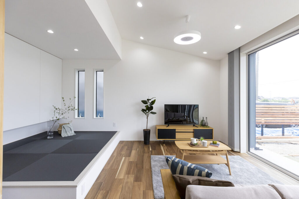 リビングの一角はくつろぎの畳コーナー 玩具をしまえる収納も完備